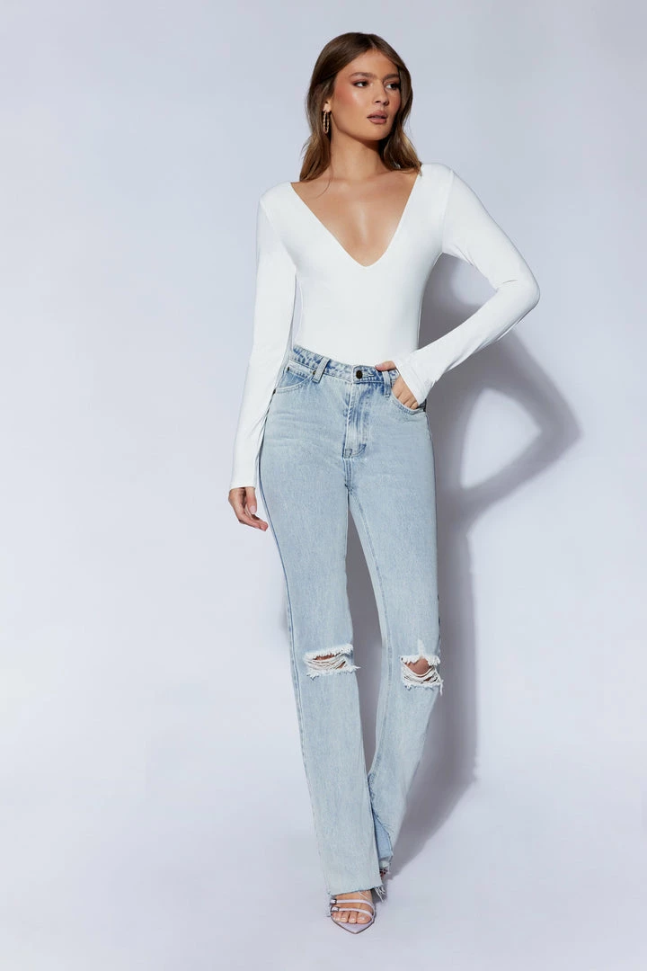 NIA is a must-have. A closet staple. Every girl needs a comfy, dependable clothing item that always makes them look good and feel good with minimal effort. That’s Nia. She’s a bodysuit classic – so she’ll always stay tucked and seamless – with long sleeves and a deep V neckline. She’s a beautiful combination of casual and kinda sexy, and she’ll always highlight your décolletage and collarbones in the best way. Dress her up with our Lola Ruched Mini Skirt to create a fetching silhouette.